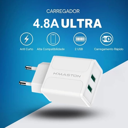2.Turbo Carregador 4.8A 2 Portas USB: potente e compacto, permite carregar dispositivos rapidamente.